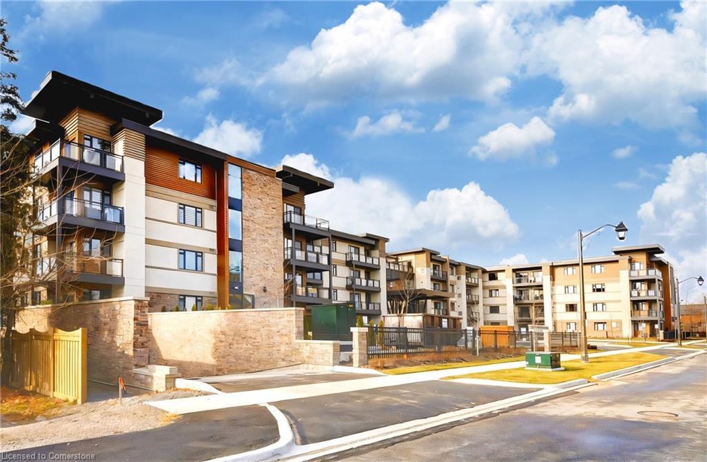 Stylish Condo Living Just Minutes from Downtown Oakville! Welcome to this bright and contemporary 2-bedroom, 2-bath end-unit condo ideally located near the lake and just a short stroll from vibrant downtown Oakville. With no neighbour on one side, enjoy enhanced privacy and quiet. Featuring an open-concept layout and elegant design touches, this unit offers comfort, convenience, and a relaxed urban lifestyle. The spacious living and dining area opens to a west-facing private balcony with unobstructed views over a manicured private school field, complete with a gas hookup for your BBQ, perfect for outdoor entertaining.The sleek kitchen is both stylish and functional, featuring Super White granite countertops, a Blanco stainless steel undermount sink, stainless steel appliances, and ample cabinet space. Both bedrooms are generously sized, and the bathrooms include upgraded cabinetry, adding a refined touch. Additional highlights include in-suite laundry, one underground parking space, and a storage locker for added convenience.Enjoy boutique building amenities like a fully equipped fitness centre, party room, lounge, and a rooftop terrace with beautiful views. All this just minutes from Oakville's waterfront, trails, parks, shops, restaurants, and GO transit. Whether you're a first-time buyer, investor, or looking to downsize, this home combines comfort, style, and a prime location.Extras: Torlys Terrawood satin-finish flooring in Trend Driftwood, stainless steel fridge, stove, built-in dishwasher, microwave, stacked washer/dryer, Hunter Douglas blackout + sheer blinds, and window coverings.