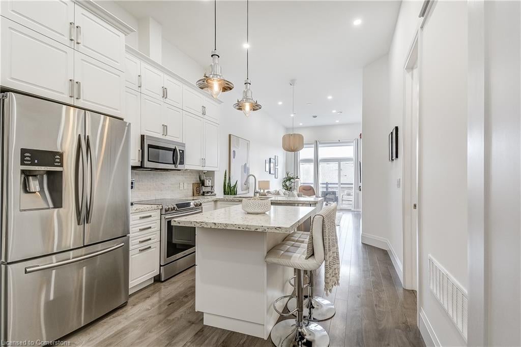STUNNING! This is simply the only word one can use to describe this truly magazine worthy condo. Soaring 11 Ft ceilings with elegant 8 foot tall doors, stepping into this home for the first time is nothing short of Breathtaking. Oversized modern windows flood the living space with natural light, while the newly painted Benjamin Moore Chantilly lace paint provides the perfect airy canvas for your interior design. The well laid out kitchen provides lots of quartz countertop for prep space, while the peninsula allows you to work in the kitchen while entertaining and being part of the conversation in the living room. Adding to the grand feel is the double-high premium cabinets with crown moulding providing lots of extra storage. All new light fixtures and potlights were installed throughout in 2021, all of which are on wifi smart light switches. Create beautiful mood lighting and various lighting scenes with a simple voice command. The large primary bedroom has ensuite access to the 4-pc bath and the stackable laundry set hidden behind the sliding door makes for an easy laundry day. A second bedroom with gorgeous skylight and oversized closet provide a lot of versatility to the unit. Outside is a tranquil 19'x5' deck to enjoy morning coffees. Upstairs are two large roof-top terraces with lounges, Fire-table, and BBQ's, as well a games and entertainment room for when entertaining bigger parties. The unit is situated near the highway, The Grand River and many hiking trails.