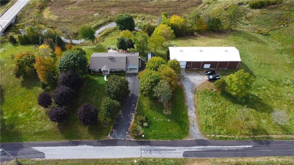 Welcome to 17 Cemetery Rd! A custom built 1982 bungalow full of character, conveniently located mins from Hwy 403/Brantford, 46.82 acres with frontage on 2 roads. The main floor offers 2000 sq.ft of living space including the retrofitted garage, spacious living room with hardwood floors, a generous sized Primary bedroom, an additional guest room and a 4pc bathroom. Updated open concept kitchen with granite countertops and a 10’ island ideal for entertaining, which opens to a dining room with 8’ patio doors walking out to the upper deck with gorgeous views. An additional 1690 sq.ft of finished living space on the lower level with a spacious rec room, a beautiful stone fireplace, corner bar, additional bedroom with oversized windows letting in ample natural light, 3pc bath, laundry and multiple utility/storage/cold rooms, patio doors walkout to the 600 sq.ft deck for more views. Rustic garden shed with conc. Floor, hydro and metal roof. Approx 38ac of workable land incl random tile for excellent drainage, 40’ x 100’ metal clad shop separated into 40x30’ insulated/heated bay w/16’ ceilings, 16’ overhead door with opener, concrete floor with hydro, and a 40x70’ storage area with another powered garage door and 2 oversized doors for larger equipment. Extras – circular driveway, well and cistern, additional 5000+ sqft of indoor storage in the barn.