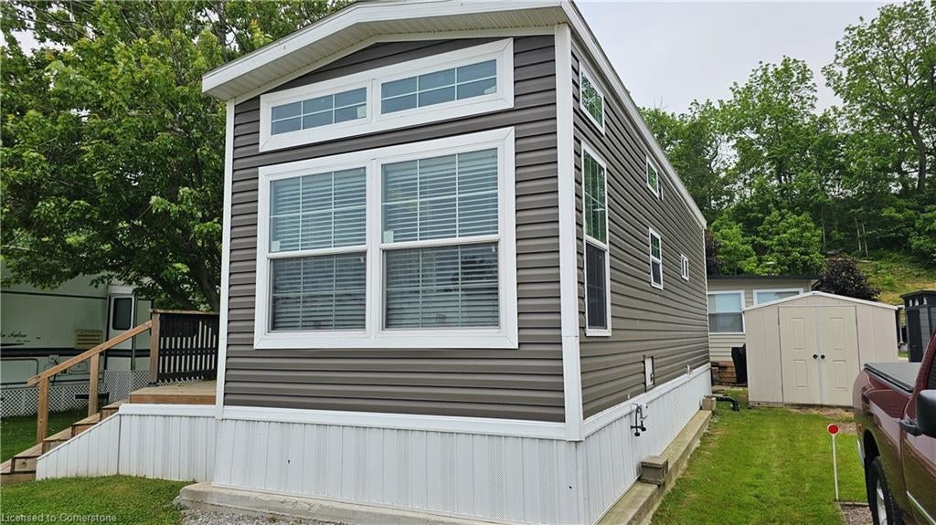 Modern, move-in ready seasonal mobile home in the sought-after Collins Harbour Marina Resort, just minutes from the heart of Port Rowan. Enjoy the seasonal lifestyle from April to October in this stylish unit featuring high ceilings, abundant natural light, and a bright open layout. The spacious kitchen includes a centre island, stainless steel appliances, recessed lighting, and ample storage. The cozy living room features a tray ceiling and electric fireplace, while the primary bedroom offers built-ins for efficient use of space. A large 10' x 33' deck extends your living space outdoors. Marina amenities include boat slips (available for $1,200/season), a playground, pool, rec hall, and more.