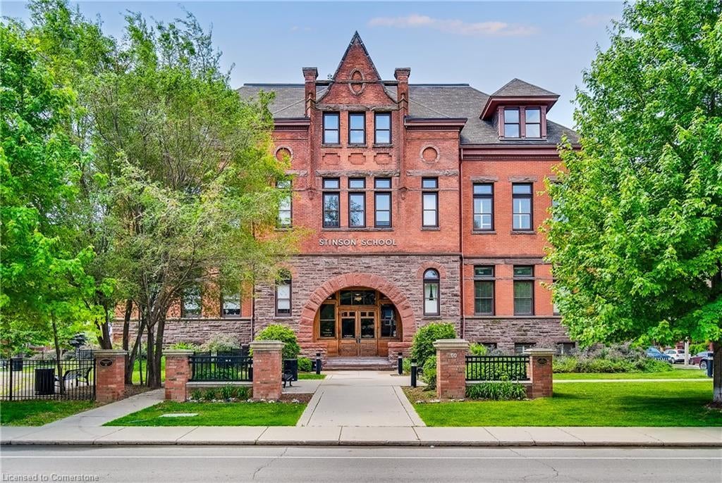 Welcome to a showstopping, one-of-a-kind hard loft in the iconic Stinson School Lofts. Originally built in 1894 and thoughtfully converted into a boutique residential building, this landmark Victorian schoolhouse blends historic architecture with modern design in a way that’s truly unmatched. This spacious ground-floor 1-bedroom, 1-bathroom loft boasts soaring ceilings, exposed brick walls, and industrial-style exposed ductwork, creating an authentic and edgy loft aesthetic. The expansive open-concept living area is filled with natural light and features updated pot lighting throughout, making it the perfect space to relax or entertain. A standout feature of this unit is the sunken den—an architectural gem that adds charm and flexibility. Whether used as a wine cellar, cozy office, or creative space, it brings a unique layer of character rarely found in today’s condo market. The modern 3-piece bathroom includes a sleek glass shower, and the oversized concrete patio offers a private outdoor retreat—ideal for morning coffee, evening cocktails, or even a small garden setup. Located just minutes from Hamilton’s vibrant downtown, the Wentworth Stairs, and Escarpment trails, this home offers the perfect balance of urban lifestyle and nature. The Stinson School Lofts is a pet-friendly building with a strong sense of community, ideal for professionals, creatives, and anyone seeking a space that stands apart.