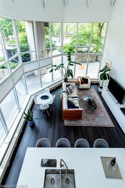 Welcome to the Core Lofts in beautiful Durand North, where city living meets comfort and style. Tucked away in a prime location, this building offers the perfect blend of convenience and tranquility. Enjoy modern amenities including secure video-monitored entry, a fitness centre, a stylish party room and a breathtaking rooftop patio. This exceptional two-storey main-level loft offers over 1,300 square feet of thoughtfully upgraded living space. Designed with both function and flair, the home greets you with soaring ceilings and a dramatic feature wall. The main floor includes a spacious bedroom, a full bathroom, a contemporary open-concept kitchen and dining area that flows into a stunning living room. Here you’re surrounded by panoramic windows and 24-foot ceilings that flood the space with natural light. Upstairs, a beautifully crafted maple staircase leads to your private primary retreat. Overlooking the main living area, this serene space features a generous bedroom with a cozy electric fireplace and a spa-like four-piece ensuite. Move-in ready and designed to impress, this loft is a rare opportunity to own a piece of modern luxury in one of the city's most desirable buildings. Don’t miss your chance to fall in love. Don’t be TOO LATE*! *REG TM. RSA.