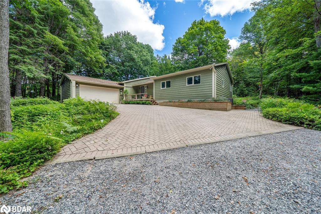 This well-maintained custom-built Viceroy Landmark Model home was extensively renovated in 2012 with noted upgrades and improvements. The rural property is 2 acres with perennial gardens, an interlocking brick driveway and a recently graded laneway surrounded by a mixture of mature trees and Muskoka rock. This private wooded lot is well treed with 247 feet of frontage on a year-round maintained road. Well setback from the main roadway the placement of the attached double car garage, with a mature tree lined long winding driveway and porched front entrance offers a welcoming courtyard approach to this immaculate 3-bedroom custom-built Viceroy country home located just minutes from downtown Huntsville, scenic walking trails, swimming and 40 miles of boating. Next to the laundry/mud room, which has garage and side porch access, is an oversized farmhouse style kitchen with extensive shaker style solid maple cabinets, granite counter tops, a centre island, and greenhouse solarium. A vaulted ceiling main entrance foyer, with overhead skylights, incorporates a mirrored double sized coat closet and a two-piece powder room that overlooks the sunken living room. The den is south facing and flooded with natural light, which has a propane gas fireplace and exterior French door exit to the backyard deck. The three-bedroom wing is well zoned for privacy, with the spacious primary bedroom having ensuite bathroom access. There is a side door exterior entrance to the unfinished basement area. Low maintenance inside and out this immaculate country home is surrounded by lots of privacy, natural wooded areas, walking trails, wildlife, and year-round town services! This mature treed 2-acre property also has an invisible dog fence and shed.