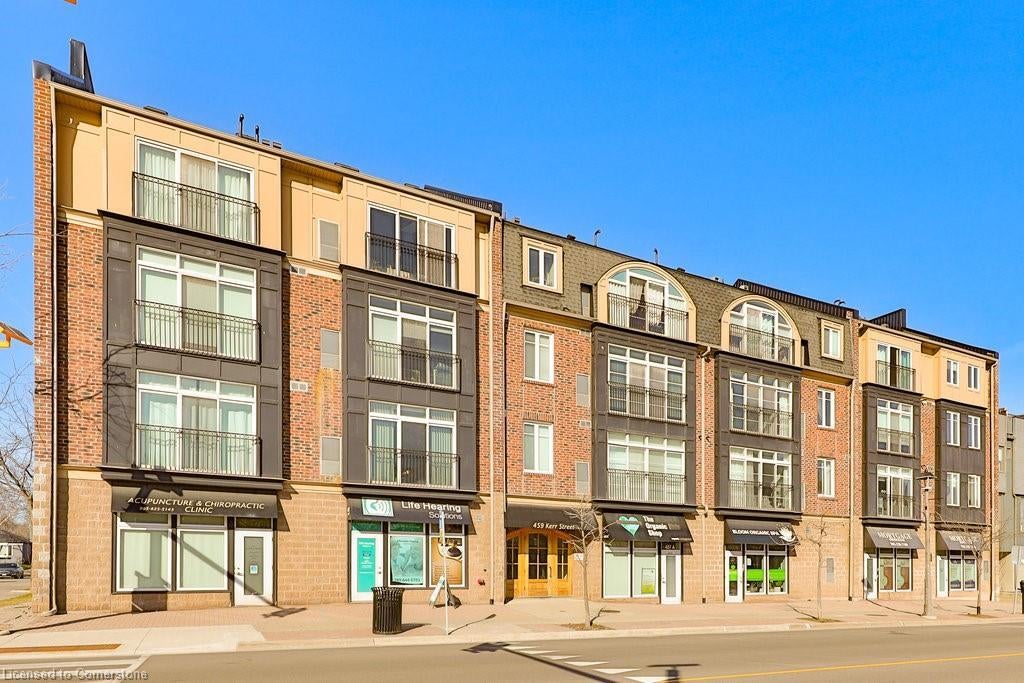 Welcome to your bright and sun-filled 1-bedroom suite, perfectly nestled in the vibrant heart of Kerr Village! This generous open-concept unit boasts an impressive 12-foot ceiling, creating a grand and spacious atmosphere that you'll love coming home to. Step outside onto your private terrace, an ideal spot to unwind on warm summer evenings or let your furry friend enjoy the outdoors. The kitchen is a chef's delight, featuring beautiful maple cabinetry, a stylish subway-tiled backsplash, and sleek stainless steel appliances. Your primary bedroom also includes an extra loft space, perfect for additional storage. With laminate flooring throughout and a neutral palette in the 4-piece bathroom, this suite offers both comfort and elegance. Kerr Village is a thriving community known for its unique charm and trendy vibe. Here, youll find an array of upscale restaurants, boutique shops, and delightful cafes just a short stroll away. Enjoy the convenience of the nearby GO station for easy commuting, and with quick access to the QEW, exploring the greater area is a breeze. Join this dynamic neighborhood and make this beautiful suite your new home!