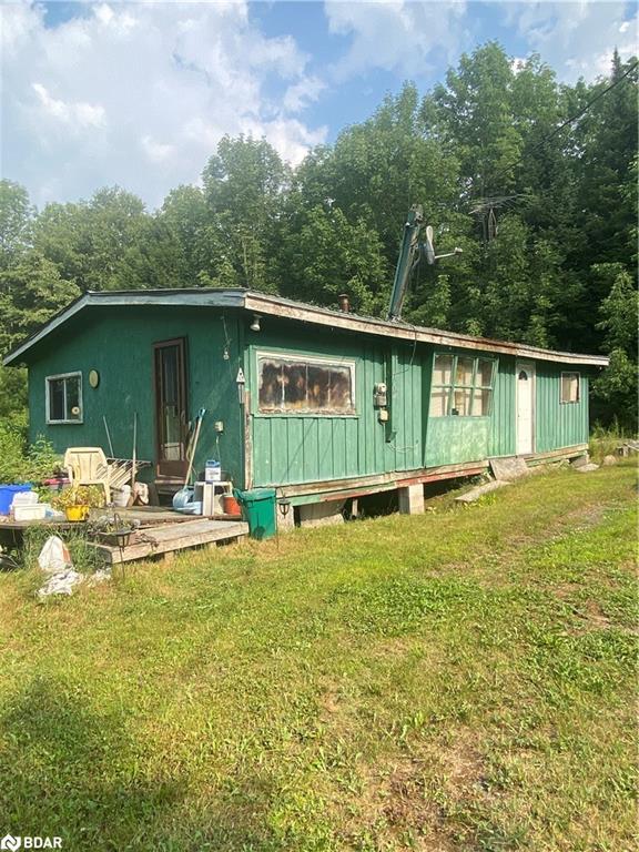 A three bedroom cottage with hydro hooked up on a 3 acre lot with landscaping and a gravel driveway with a gate. Easy to build on your new home on level bedrock for solid foudation. Just a minute from Uffington and close to water access. 10 min from shopping in Bracebridge. There is an old drilled well from the 50s with no paperwork. Year round road and level entrance with lots of privacy. It is being sold AS IS.