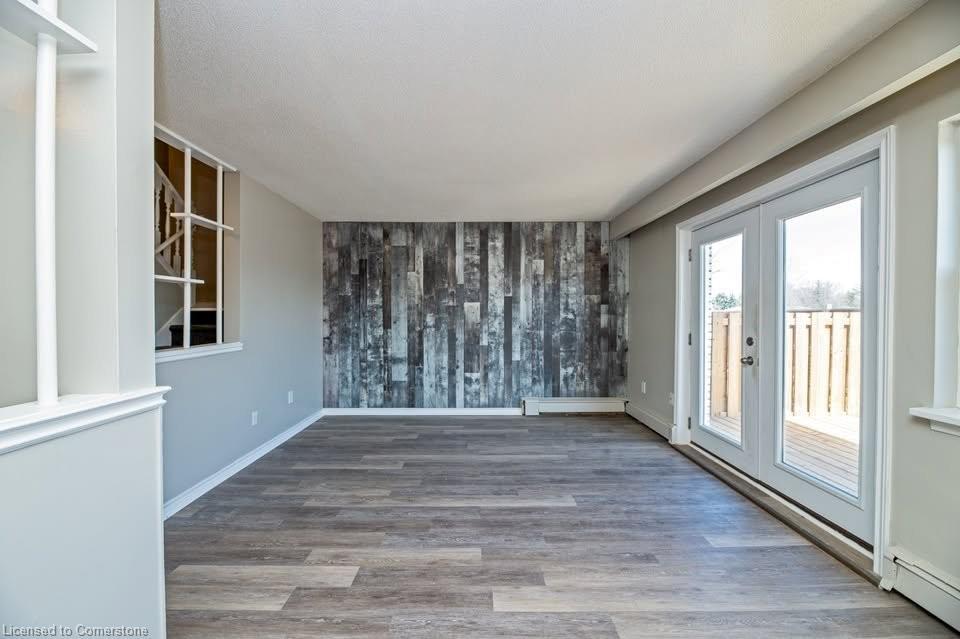 Central Location in Burlington. This 2 Level - 3 bedroom unit was newly renovated 3 years ago. Low maintenance backyard with large deck. Heat and water included. Tenant pays hydro. 1 parking spot included, extra parking available for $40 a month. Coin laundry in the basement of the building.