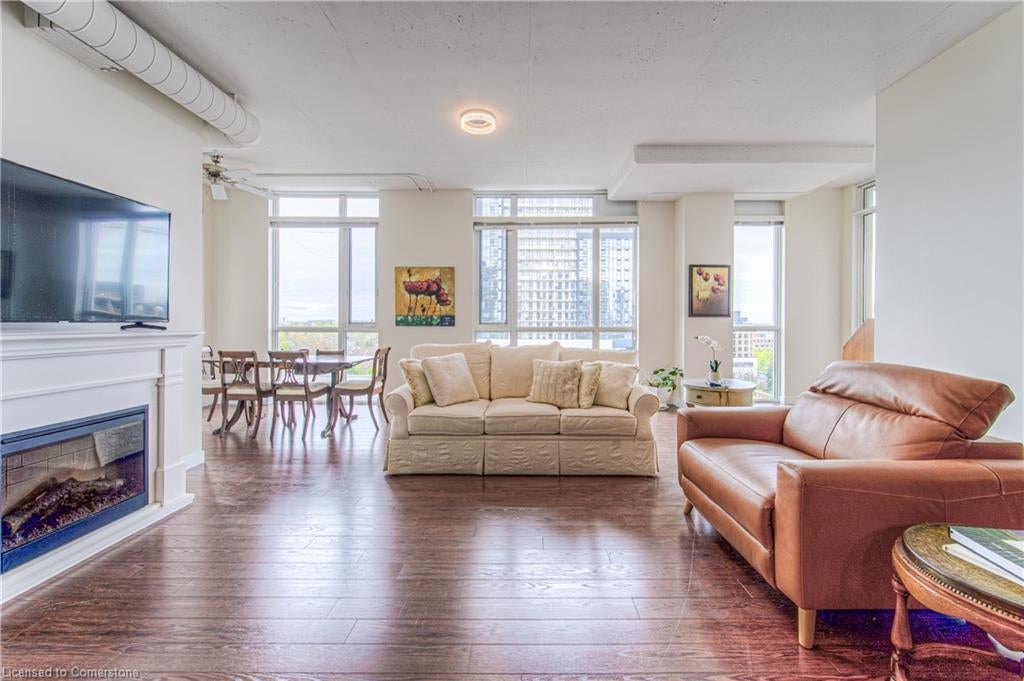 2 BEDROOM, 2 BATHROOM, 2 BALCONY CORNER UNIT! Enjoy Cityscape and Sunset views from every room and both balconies in this unit. Arguably the best floor plan in the building with a separate dining room, den and oversized living room, all with a backdrop of floor to ceiling windows. The kitchen offers an abundance of upgraded cabinets, granite countertops, undercounted lighting, and a large island with an overhang large enough for 4 stools. This unit is an entertainers’ dream. The bedrooms and bathrooms are at separate ends of the unit, perfect for a separate TV room or quiet office. Both bedrooms enjoy absolutely fabulous views of Uptown Waterloo and afar with huge corner windows. Freshly painted and updated lighting. The Bauer Lofts offer a party room leading to a huge roof top patio with bbq, & fitness room. The location cannot be beat with restaurants, coffee shop, gourmet grocery store, and other boutique shops, just steps from your front door. Walk to Uptown or jump on the LRT in front of the building. A historical building in a vibrant urban neighbourhood. Pet friendly, lots of visitor parking, and offers extra secure elevator access.