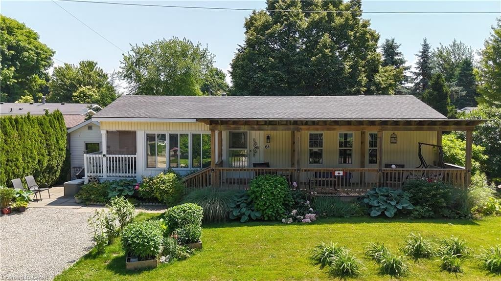 Charming two-bedroom home in the 55+ Northwood Beach Resort, with lake views! Features include open-concept kitchen/dining room with sitting den, cozy living room with gas fireplace, private deck off primary bedroom, covered porch, perennial gardens, double-wide driveway and storage shed. Recent updates: furnace and roof (2020), vinyl flooring (2021), kitchen upgrades (2023), washer (2024). Resort amenities: pool, recreation centre, community lifestyle. Minutes to Bayfield, 15 minutes to Goderich. Land lease $478.20/month.