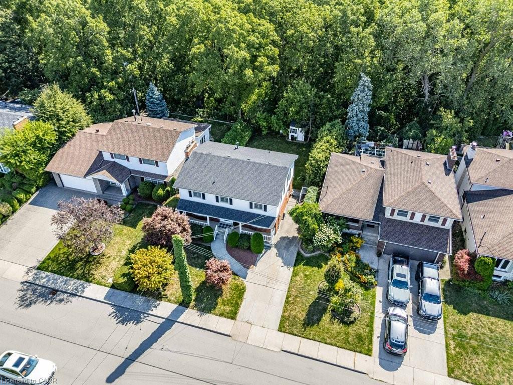 Welcome to a rare opportunity! Lovingly maintained by the same owners since 1975, this spacious four-bedroom home sits on a picturesque ravine lot along one of the area’s most sought-after streets. From the moment you arrive, you’ll notice the pride of ownership with a large covered front porch, concrete driveway for three vehicles, and a matching walkway that set the tone for what’s inside. Step into the inviting front foyer that opens up to multiple living spaces. To the left, a bright living and dining room combination features a cozy gas fireplace, large windows with California shutters, and a warm, welcoming atmosphere. To the right, a versatile main floor den makes an ideal home office or study. Down the hall, the oversized eat-in kitchen boasts updated cabinetry with plenty of storage, a double sink, built-in dishwasher, and room for family gatherings. A stylish 2-piece bathroom with quartz counters completes the main level. Upstairs, you’ll find four generously sized bedrooms, all with California shutters for added style and light control. The primary bedroom includes dual closets and convenient ensuite privileges to the family bathroom, perfect for both comfort and function. The walk-out basement provides incredible potential for an in-law suite, with two separate entrances for privacy. Here you’ll discover a spacious rec room with gas fireplace, a 3-piece bathroom, large laundry area, storage room, and even a huge fruit cellar. Step outside and enjoy your own private retreat. The backyard deck overlooks the serene ravine, offering peace, privacy, and beautiful views year-round. This is more than a home. It is a chance to own a property that has been cherished for decades and is ready for its next chapter.