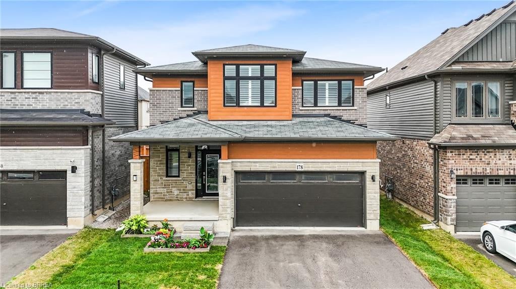 Welcome to 178 Longboat Run West—a stunning 2-storey home nestled in one of Brantford's most desirable and family-friendly communities. Thoughtfully designed with modern comfort and timeless style, this beautiful property sits on a premium 36 ft. x 114 ft. lot with no rear neighbours and features over $21,000 in upgrades! Step inside to experience open-concept living at its finest, where natural light pours across the spacious main level. Every room is enhanced with upgraded baseboards that add a refined finish, and California shutters that provide both privacy and a touch of elegance. The inviting living room showcases rich hardwood flooring, sleek pot lights, and a welcoming ambiance ideal for both relaxing and entertaining. The modern kitchen is a chef’s dream, complete with flat-panel cabinetry, quartz countertops, stainless steel appliances, and a stylish backsplash. Just off the kitchen, the dining area is ideal for family meals and gatherings, with sliding glass doors leading to a cozy patio—perfect for barbecues and enjoying warm evenings outdoors. Upstairs, the grand primary suite offers a luxurious retreat with elegant double-door entry, a spacious walk-in closet, and a spa-like ensuite. Unwind in the deep soaking tub or refresh in the oversized walk-in shower with upgraded sliding glass doors. Two additional bedrooms, a modern 3-piece bathroom with an upgraded glass shower door, and the convenience of an upstairs laundry room with window complete the second floor. The unfinished basement offers an excellent opportunity for customization, featuring large upgraded windows that fill the space with natural light and a pre-installed bathroom rough-in for added convenience. Outside, enjoy a fully fenced backyard with ample green space to play and relax throughout the seasons. This home truly has it all: modern finishes, family-friendly comfort, and an unbeatable location. Don’t miss your chance to make 178 Longboat Run West your forever home!