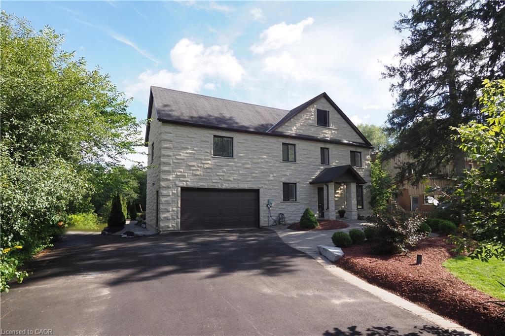 Welcome home to a stately and luxurious waterfront oasis. With a solid palatial cultured Arriscraft stone exterior, a thoughtfully designed placement of windows and balconies, an impressive overall architectural design that enhances curb and riverside appeal (not to mention interior ergonomic comfort), this home has so much more than meets the eye. Consider the following quality enhancements: A rocklike ICF structure with additionally augmented insulation, a highly efficient, multi-zoned supplementary in-floor heating system, a wheelchair friendly interlocking stone front entrance that transitions seamlessly to a spacious open concept main floor living area, a massive driveway, an oversized garage with in-floor heating, a main floor bedroom and 3 piece bathroom with roll-in shower, a separate great room with bathroom that could easily be converted to an in-law suite with separate entrance, and so much more. This spacious executive home with its perfectly sublime combination of comfort and convenience is within a short commute to Guelph and Kitchener-Waterloo, as well as within cycling distance to Elora and walking distance to downtown Fergus. Live a year-round cottage lifestyle without sacrificing urban convenience. Book your viewing and come see for yourself. Again, this home offers so much more than meets the eye.