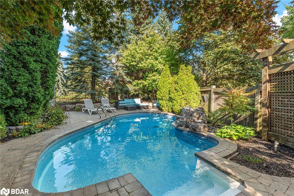 Nestled on a quiet cul-de-sac in the prestigious River Oaks neighbourhood, this executive family residence offers over 4,500 sq. ft. of beautifully finished living space and backs onto a tranquil ravine. With 5 bedrooms and 5 bathrooms across four levels, this home balances elegance, functionality, and comfort.The main floor features hardwood flooring, a dramatic great room with soaring 17-foot ceilings and a gas fireplace, a bright front living room, and a practical mudroom with laundry. The kitchen is well-equipped with stainless steel appliances, a JennAir oven, a Chef's Cooktop, and California shutters. An adjoining breakfast area opens to the rear deck, while a separate dining room provides the perfect setting for family gatherings or entertaining guests.Upstairs, three spacious bedrooms share two full bathrooms, including a serene primary suite. The third floor offers two additional bedrooms and a full bathroom, ideal for teenagers, extended family, or nanny quarters.The recently renovated lower level enhances the home with a stylish second kitchen featuring quartz countertops, a bar fridge, and a bodega wine fridge. A glass-enclosed office, sleek bathroom with custom shower, and a versatile recreation area with gas fireplace make this level perfect for a home theatre, games room, or lounge. Step outside to a private backyard designed for entertaining, complete with an inground saltwater pool, expansive deck, stone patio, and built-in BBQ with natural gas hookup. A stone driveway and double garage add to the strong curb appeal. Close to top-ranked schools, scenic trails, parks, shopping, and major commuter routes, 2000 Peak Place delivers the perfect combination of lifestyle, space, and location in one of Oakville's most sought-after communities.