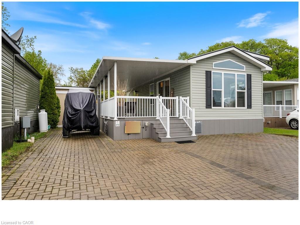A rare opportunity in Wyldewood Beach Club! Welcome to Unit #213—a newer, fully financeable 2-bedroom, 1-bathroom cottage with no rear neighbours, just a stone's throw from Lake Erie beaches.This well-maintained unit features a spacious composite deck, partially covered with an extended section and a custom fire pit patio—perfect for outdoor living and entertaining. Inside, enjoy an open-concept layout with vaulted ceilings and transom windows, creating a bright, airy atmosphere throughout the kitchen, dining, and living areas. The kitchen is equipped with stainless steel appliances, ample cabinetry, and a peninsula breakfast bar for casual dining. The primary bedroom includes built-in cabinetry for extra storage, while the second bedroom offers bunk beds with full-step access to the top bunk—a safe and thoughtful design. Additional features include a large storage shed and low-maintenance finishes, all set in a highly desirable location close to the lake but without the additional waterfront premiums. Don’t miss this unique chance to own in one of Sherkston Shores’ most popular gated communities.