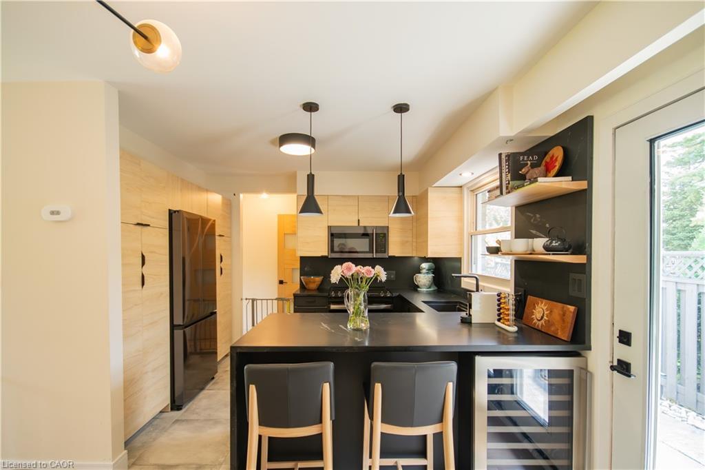 Located in the quiet Golden Gardens neighbourhood of Simcoe, this beautifully updated 3-bedroom, 2-bath home combines modern style with comfortable living. Recent upgrades throughout the home showcase exceptional attention to detail, giving it a fresh urban touch. The kitchen is a true highlight, featuring sleek modern cabinetry, striking black granite countertops with a matching backsplash, a peninsula with a waterfall edge, open shelving and five stainless steel appliances. The semi-open concept design creates a seamless flow between the kitchen, dining, and living areas - ideal for family gatherings or entertaining. Garden doors open to a private stamped concrete patio, offering the perfect space for outdoor dining, barbeques, or quiet relaxation. The finished basement adds valuable living space with a modern rec room, laundry area, power room, and a flexible bonus room ready to be customized to suit your needs. Practical updates provide peace of mind, including a new air conditioning unit (2022) and a 200-amp breaker panel with generator hook-up, leaving ample room for additions such as a hot tub, pool or EV charger. Generous storage throughout the home, including a secure storage area tucked neatly within the covered double carport—perfect for seasonal items or outdoor gear. The outdoors has been maintained as meticulously as the indoors including the front garden of native plants certified by the Canadian Wildlife Federation. With its modern finishes, welcoming layout, and move-in ready condition, this home offers the perfect balance of style and comfort in a quiet, family-friendly neighbourhood.