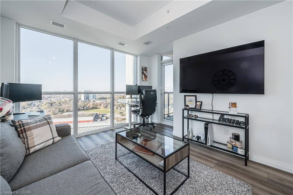 HIGHLY SOUGHT-AFTER GARMENT CONDOS! This one bed, one bath unit comes with one parking space. Bright kitchen with clean lines, breakfast bar, premium flooring, great sized bedroom, 4pc bathroom, nook that is perfect for a desk or coffee station, in-suite laundry, balcony, one underground parking space. With some of the nicest finishes selected, you will feel at home the moment you walk in! The building offers some of the best amenities a building offers in Downtown Kitchener: rooftop pool, fitness room, party room, relaxation area, yoga spot, pet run, urban park, sport court, it's no wonder this is the place to be. Located steps to downtown Kitchener, Google, KPMG, Deloitte, future LRT hub, Go Train, D2L, Communitech, School of Pharmacy, School of Medicine, Victoria Park, shops, restaurants, entertainment and so much more! Rogers Base Internet, heat, a/c and water included in fees. Tenant to pay hydro, cable/tv, tenant's insurance.