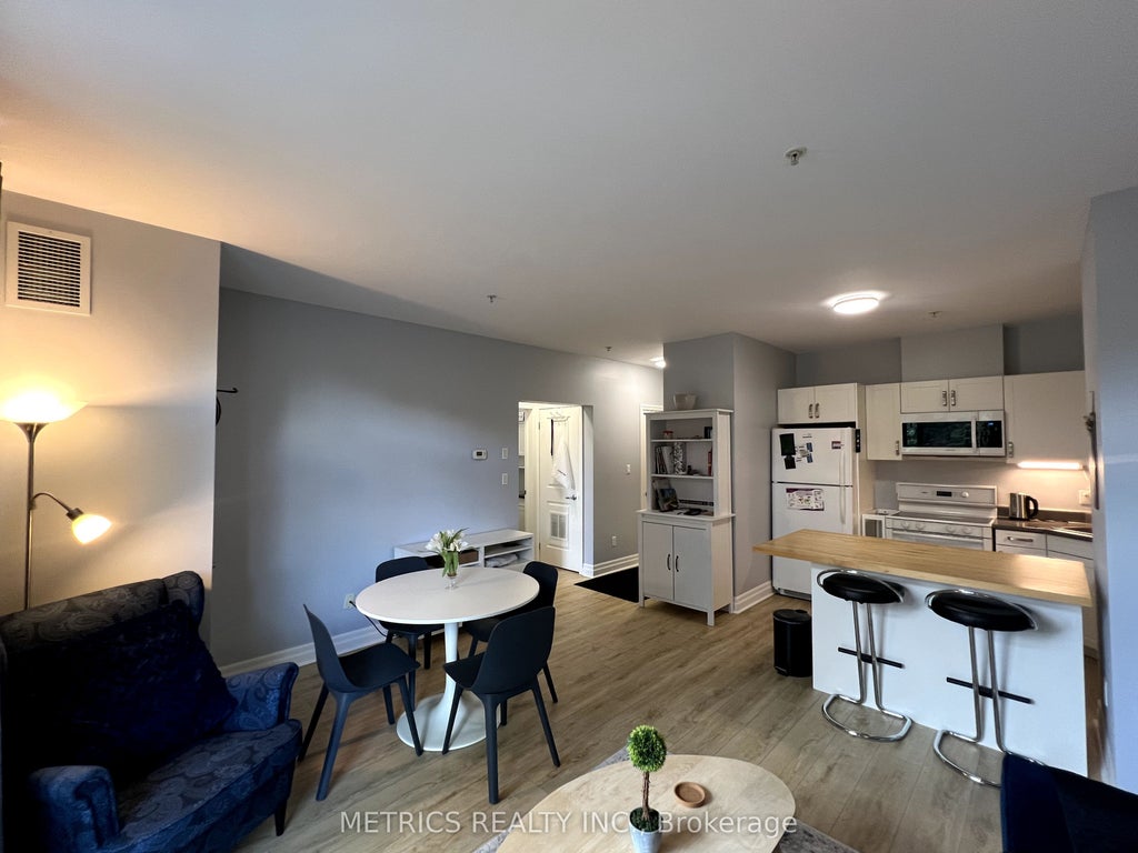 Welcome to vibrant Kerr Village! Kerr Studios is a boutique-style condo in an unbeatable location.This bright and spacious 2-bedroom, 2-bathroom comes fully furnished. The open-concept design features an excellent layout with each bedroom having its own private bathroom perfect for comfort and convenience. This rare east-facing unit is filled with natural light and enjoys peaceful views of mature trees from the quiet side of the building. Just steps from Oakwood PS, trendy restaurants, cafés, and shops, with Oakville GO,Trafalgar Park Community Centre, and the QEW minutes away. Enjoy leisurely walks to Hogs BackPark or down to the lake at Tannery Park.