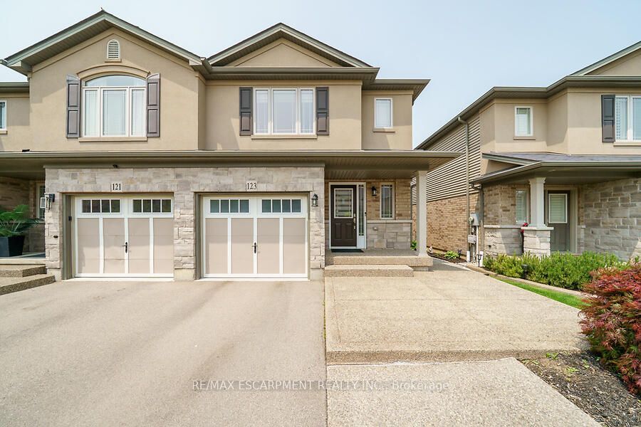 This custom-designed 1,700+ sq. ft. freehold end-unit townhome sits on an oversized lot and offers a perfect blend of style and functionality. The open-concept main floor boasts a spacious dining area with a servery/coffee bar/wine cooler, a bright white kitchen with granite counters and newer appliances, and a stunning great room with an electric fireplace feature wall and custom built-ins - an ideal setting for entertaining. Upstairs, you'll find a versatile loft, a full main bath, and three bedrooms, including a primary suite with walk-in closet and private 4-piece ensuite. The lower level is unfinished, Step out from the great room to a tiered patio overlooking a private, fenced backyard with no rear neighbours and direct access to the Felker Falls trail system. Additional highlights include double-wide parking and a prime location within walking distance to schools, parks, Valley Park Recreation Centre, and scenic trails, plus just minutes to shopping, restaurants, the Red Hill, LINC, and QEW for easy commuting.